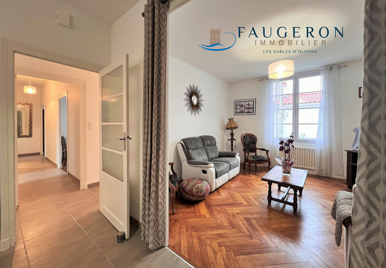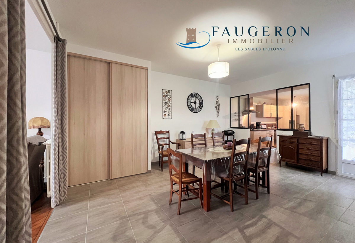 LA CHAUME - Confortable Maison de caractère de 113 m² hab. de plain-pied = double salon/séjour, 3 grandes chambres, SdB et SdE, cuisine moderne équipée, arrière-cuisine et rangements, terrasse ensoleillée et cour 60 m² + précieux Garage. Belle opportunité, tout proche du Marché et du Quai